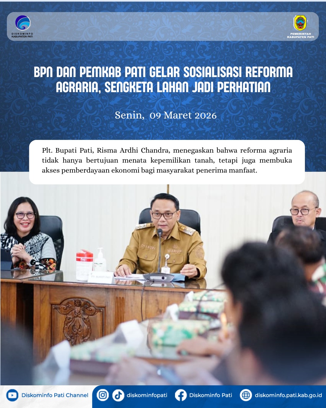 Pemerintah Kabupaten Pati bersama Badan Pertanahan Nasional (BPN) terus memperkuat upaya penyelesaian sengketa lahan di Desa Pundenrejo, Kecamatan Tayu. Hal itu nampak dalam kegiatan Sosialisasi Pelaksanaan Reforma Agraria di atas Hak Pengelolaan (HPL) Badan Bank Tanah, yang digelar di Ruang Kembangjoyo Setda Pati, Senin (9/3).