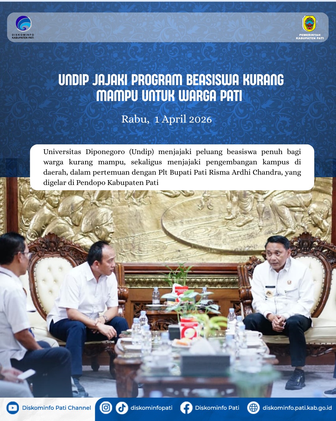 PATI, 1 April 2026 — Universitas Diponegoro (Undip) menjajaki peluang beasiswa penuh bagi warga kurang mampu, sekaligus menjajaki pengembangan kampus di daerah, dalam pertemuan dengan Plt Bupati Pati Risma Ardhi Chandra, yang digelar di Pendopo Kabupaten Pati, hari ini.