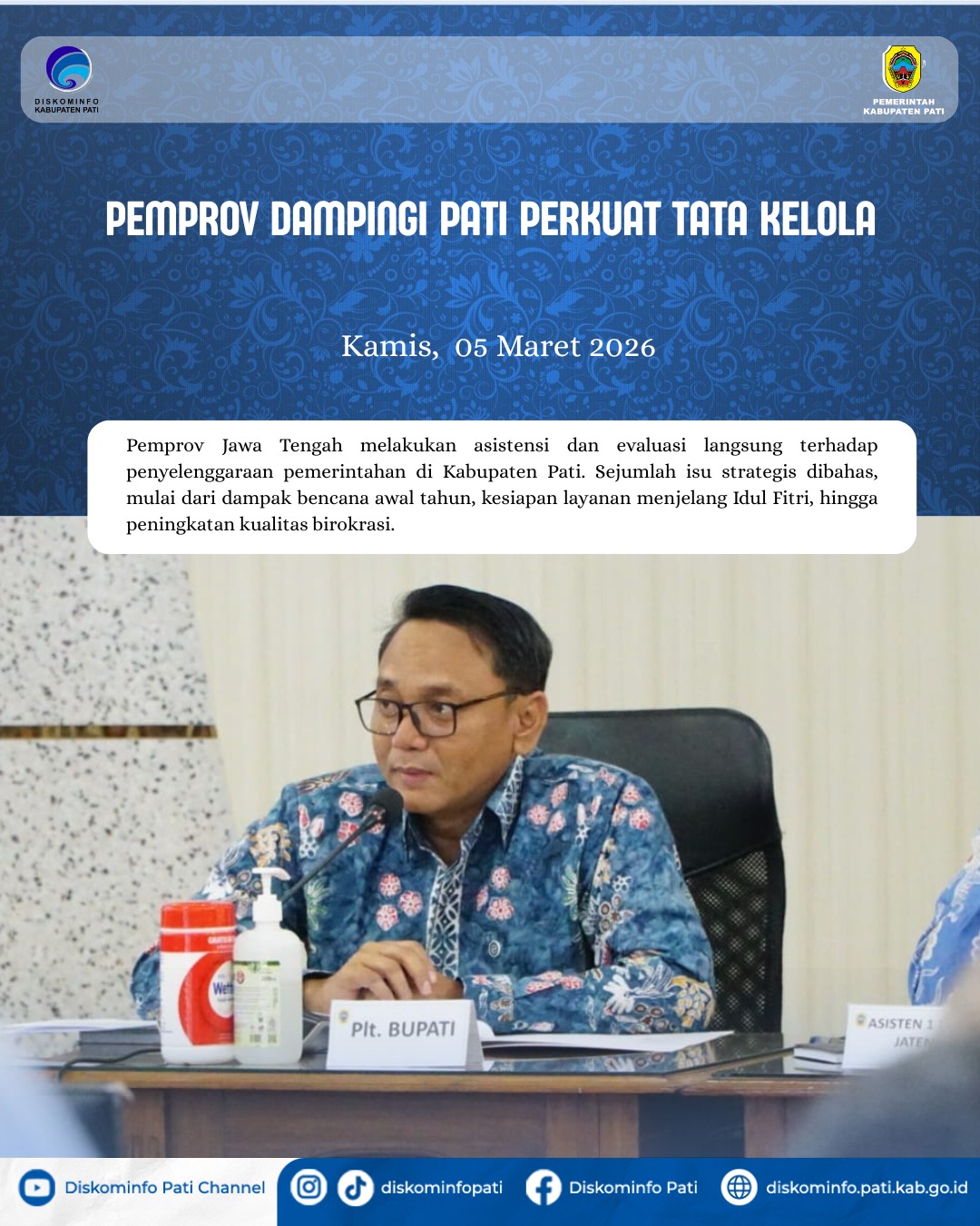 PATI, 5 Maret 2026 — Pemerintah Provinsi Jawa Tengah melakukan kegiatan asistensi, monitoring, dan evaluasi terhadap penyelenggaraan pemerintahan di Kabupaten Pati yang berlangsung di Ruang Kembangjoyo Setda Pati.