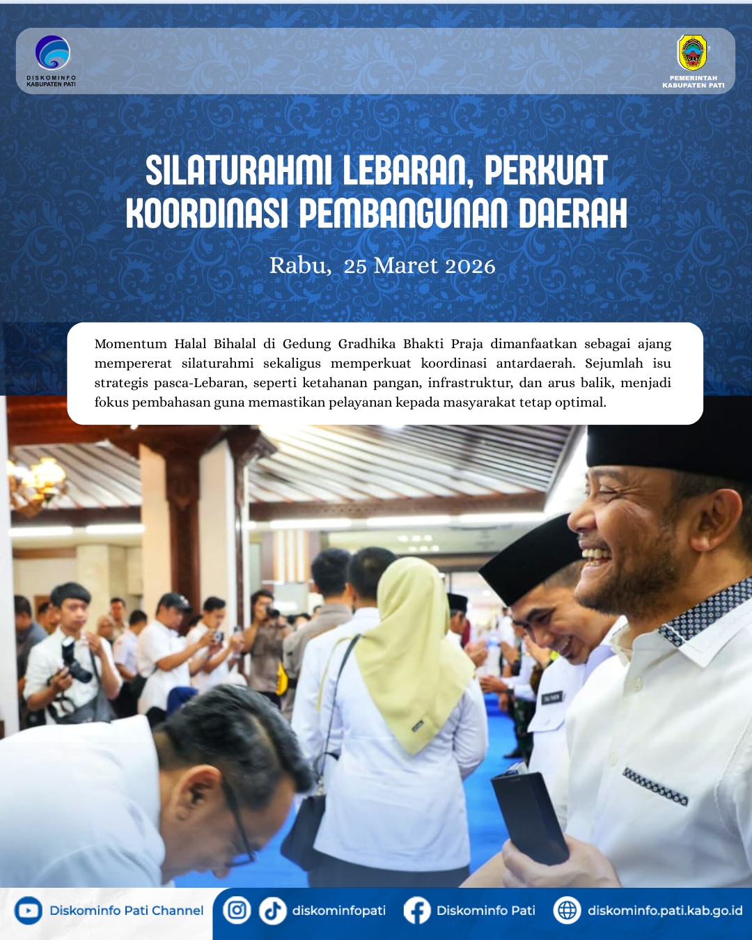 “Ini tidak hanya momen silaturahmi, tapi juga sebagai forum koordinasi. Kami juga berkoordinasi dengan Pak Gubernur karena ini sangat penting sekali. Karena setelah lebaran ini banyak sekali koordinasi-koordinasi yang terkait ketahanan pangan, infrastruktur, dan semuanya ini kami koordinasikan dengan Pak Gubernur. Habis ini kita akan mengkoordinasikan terkait arus balik yang dari Kabupaten Pati,” ujarnya.