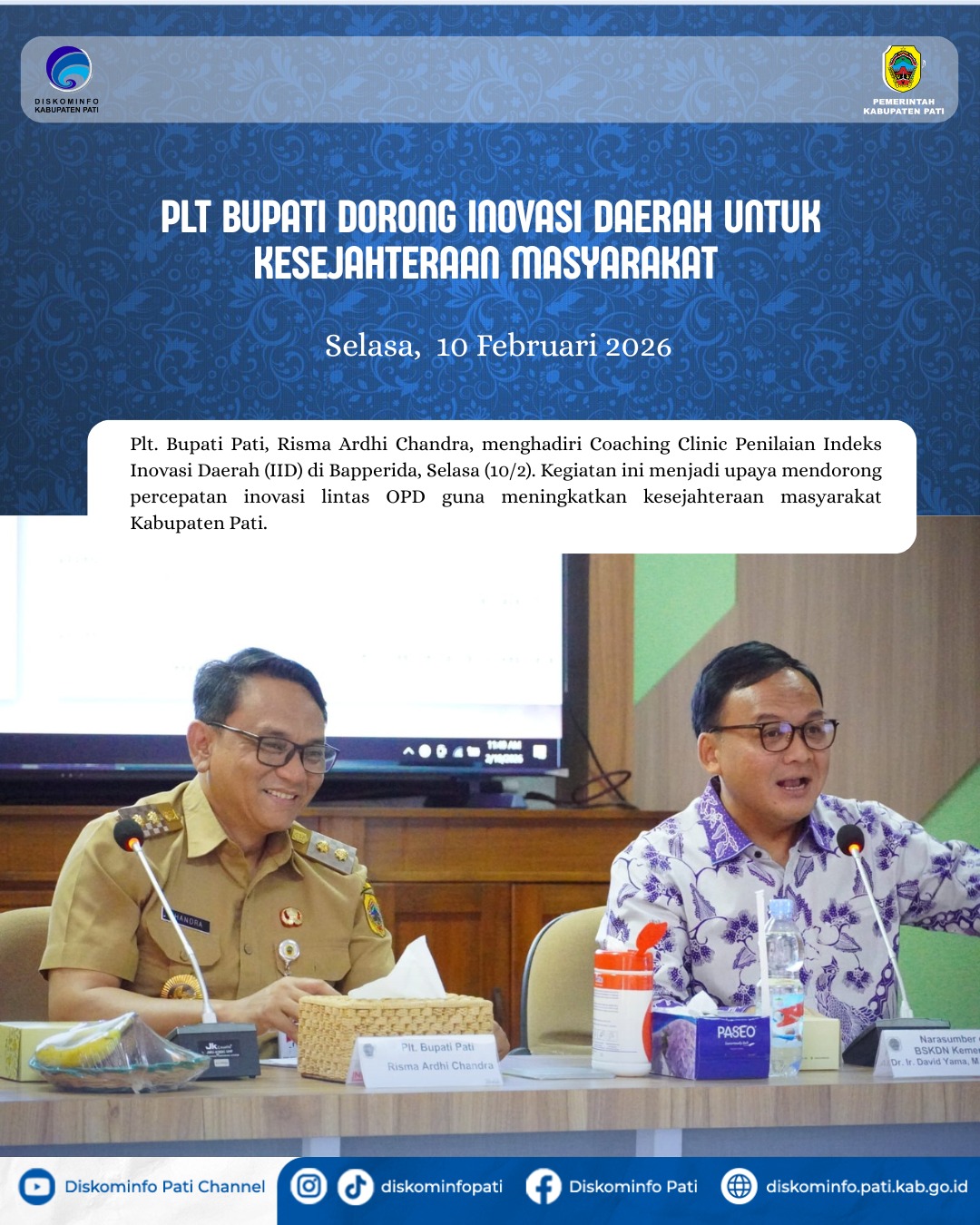 PATI, 10 Februari 2026 — Plt. Bupati Pati Risma Ardhi Chandra menghadiri Coaching Clinic Penilaian Indeks Inovasi Daerah (IID) di Ruang Rapat Rajawali Bapperida. Kegiatan ini menjadi bagian dari upaya Pemerintah Kabupaten Pati untuk meningkatkan kualitas dan kuantitas inovasi daerah untuk peningkatan kesejahteraan masyarakat.