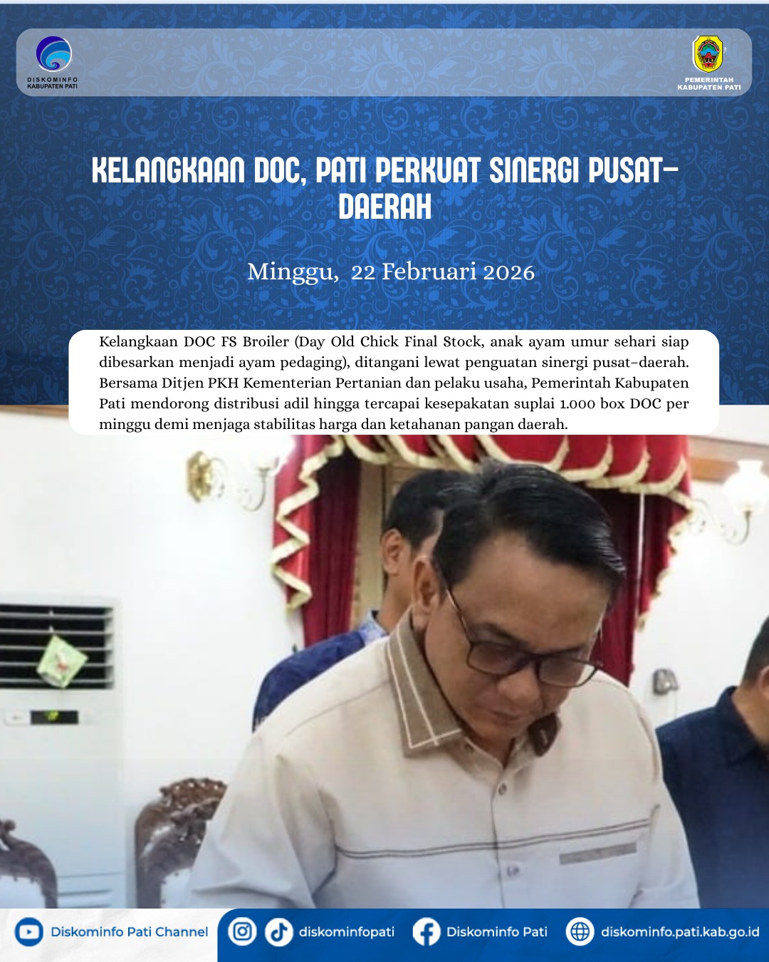 PATI, 22 Februari 2026–Kelangkaan DOC FS Broiler (Day Old Chick Final Stock, anak ayam umur sehari siap dibesarkan menjadi ayam pedaging) sejak pertengahan 2024, mendorong Pemerintah Kabupaten Pati memperkuat koordinasi dengan pemerintah pusat. Rapat koordinasi strategis pun digelar Minggu (22/2) di Ruang Pringgitan Pendopo Kabupaten Pati dan dipimpin langsung Direktur Jenderal Peternakan dan Kesehatan Hewan (PKH) Kementerian Pertanian, Agung Suganda.