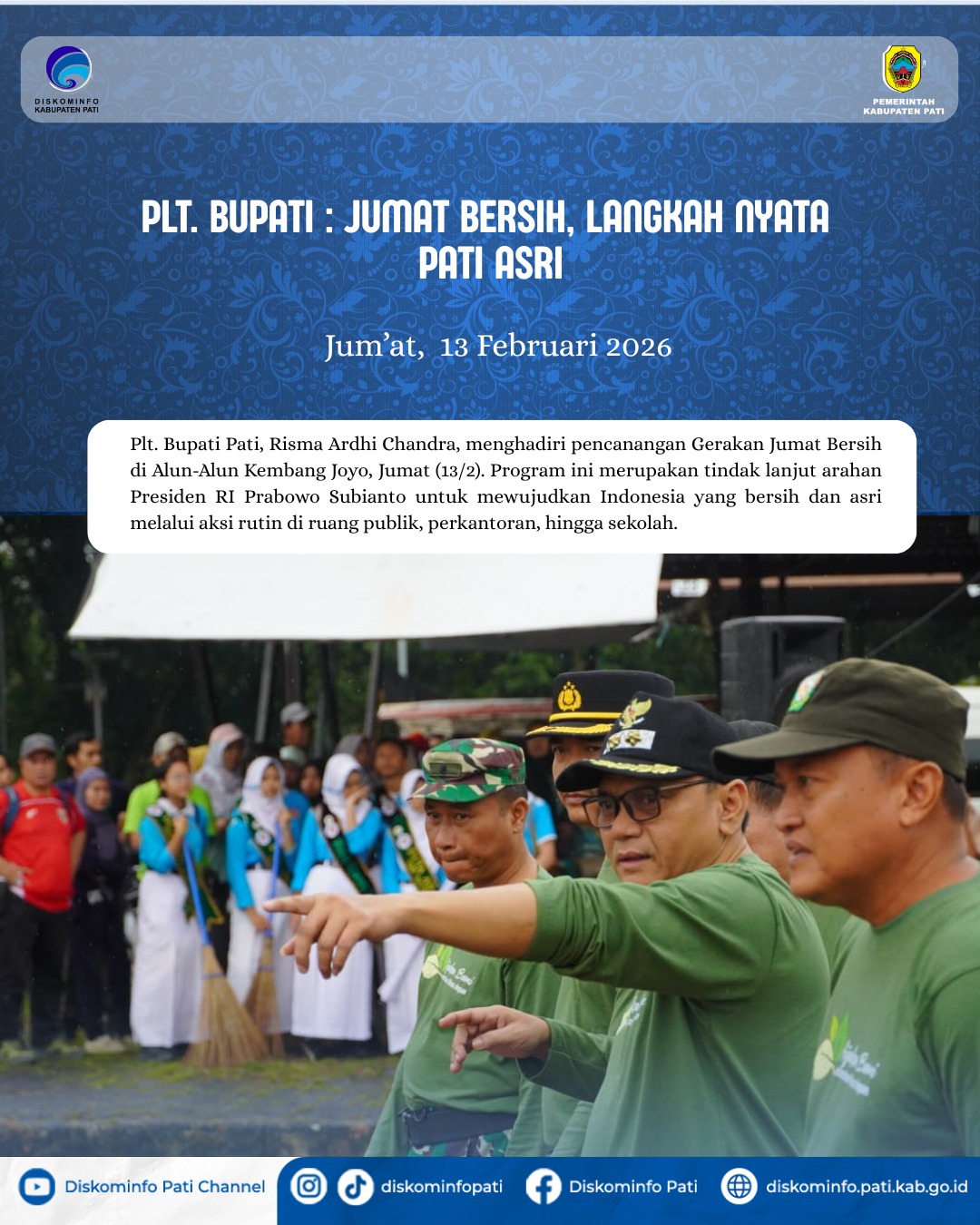 PATI, 13 Februari 2026 — Plt. Bupati Pati, Risma Ardhi Chandra, menghadiri sekaligus mendukung pencanangan Gerakan Jumat Bersih yang digelar di Alun-Alun Kembang Joyo. Kegiatan ini menjadi tindak lanjut program nasional Indonesia Asri dan diarahkan sebagai rutinitas bersama untuk menjaga kebersihan serta penghijauan di ruang publik dan lingkungan kerja.