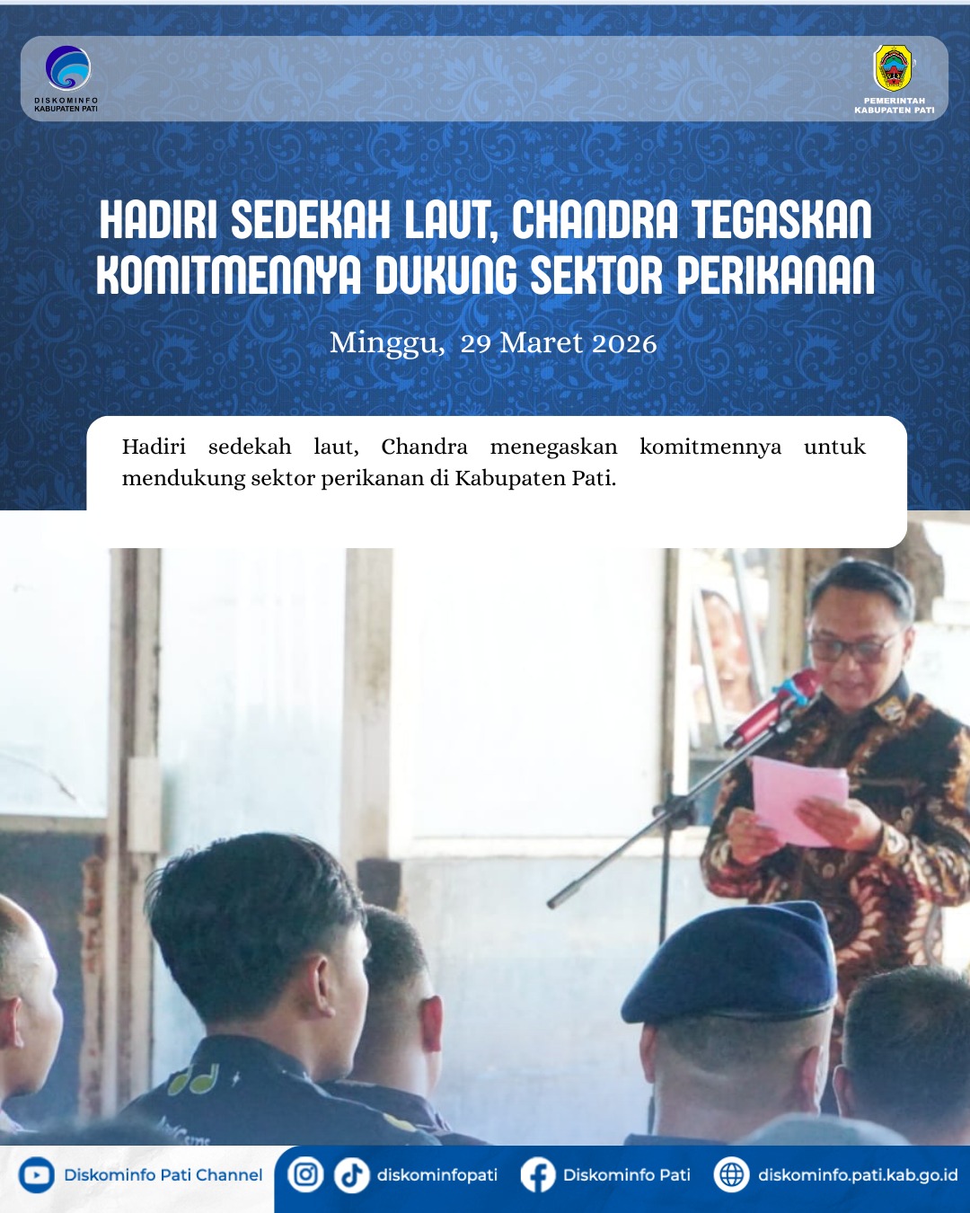 Chandra menyampaikan bahwa kehadirannya bukan hanya sebagai bentuk penghormatan terhadap budaya lokal, tetapi juga sebagai wujud dukungan nyata terhadap sektor perikanan yang selama ini menjadi andalan Kabupaten Pati.